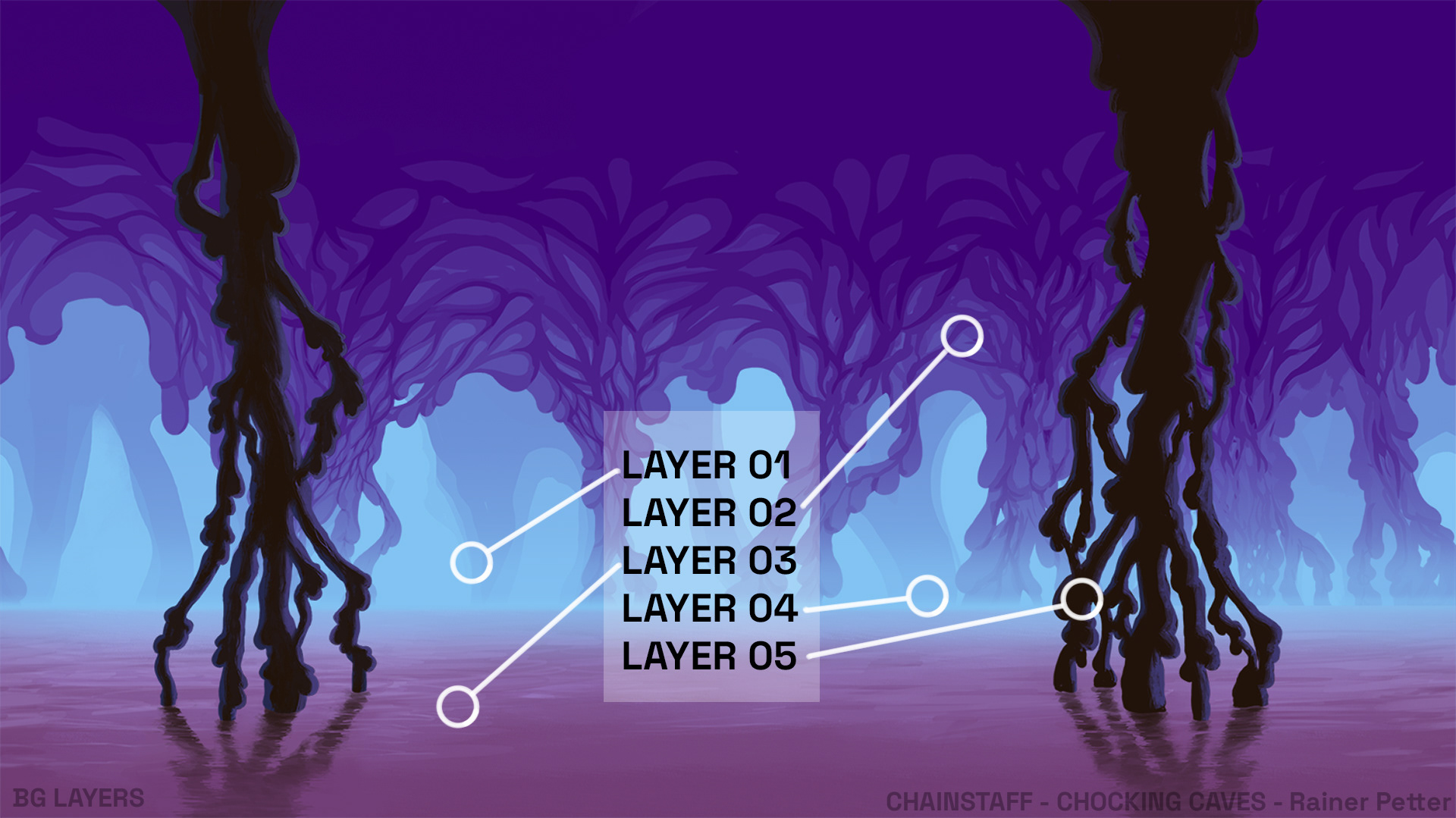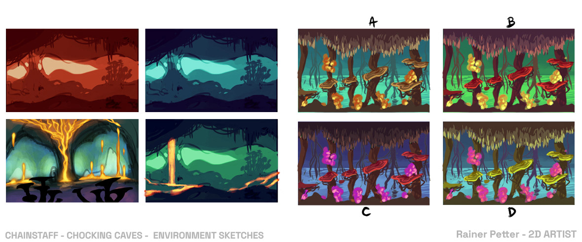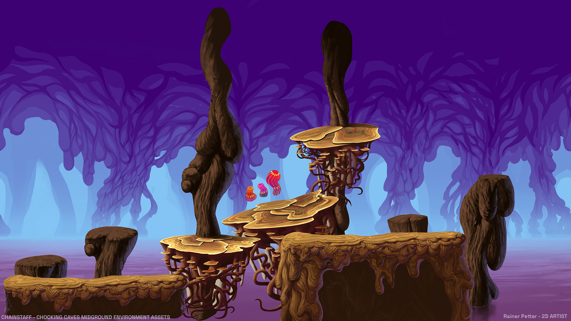 I had the pleasure to work with Nathan Fouts from Mommy's Best Games on their most recent game: Chainstaff. I did part of the art direction, concept art, and final 2D assets of the environments and some monsters. The main challenge was to keep the amazing and strange MBG classic visuals, mixing with references from 70s album covers and fantasy illustrations. Here I'm sharing the artwork of the level Choking Caves.